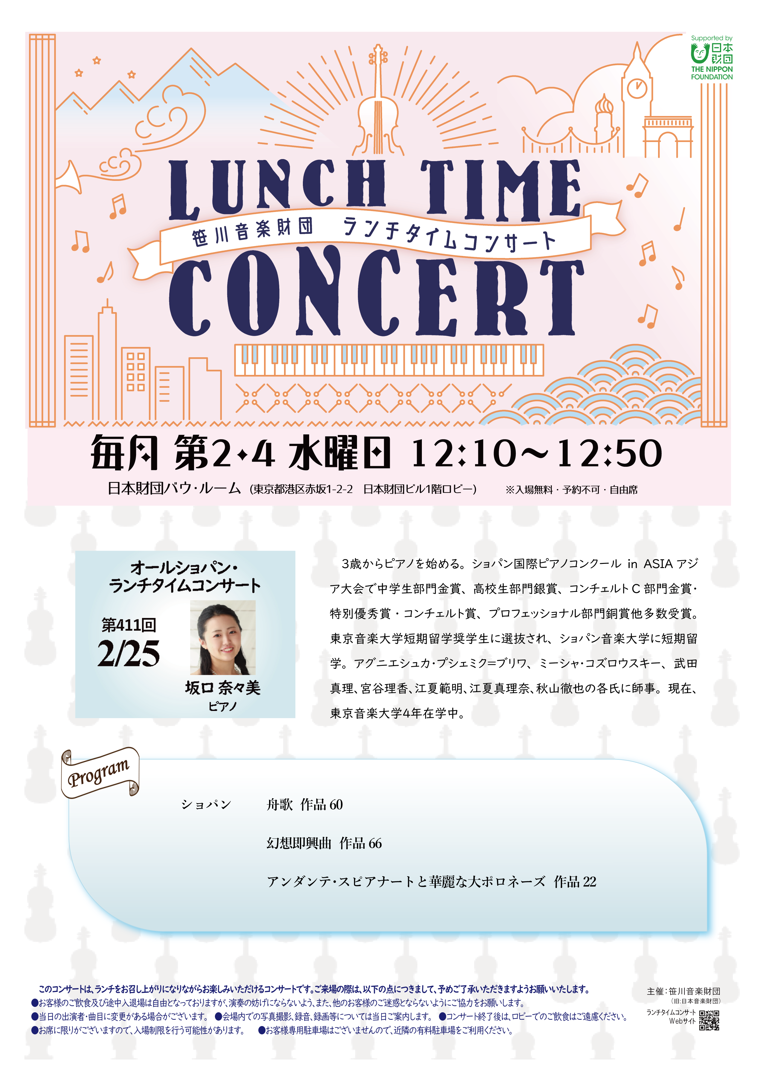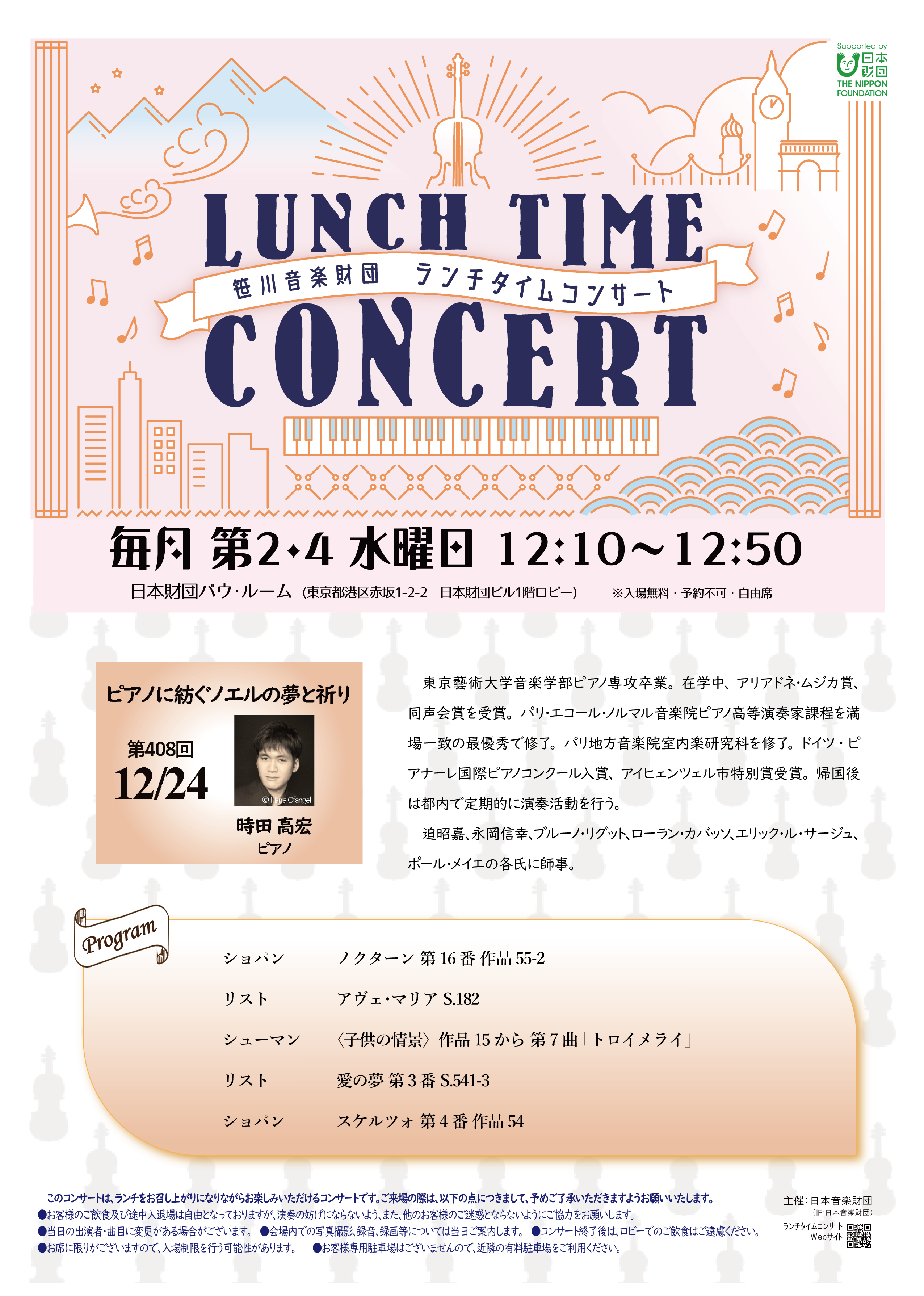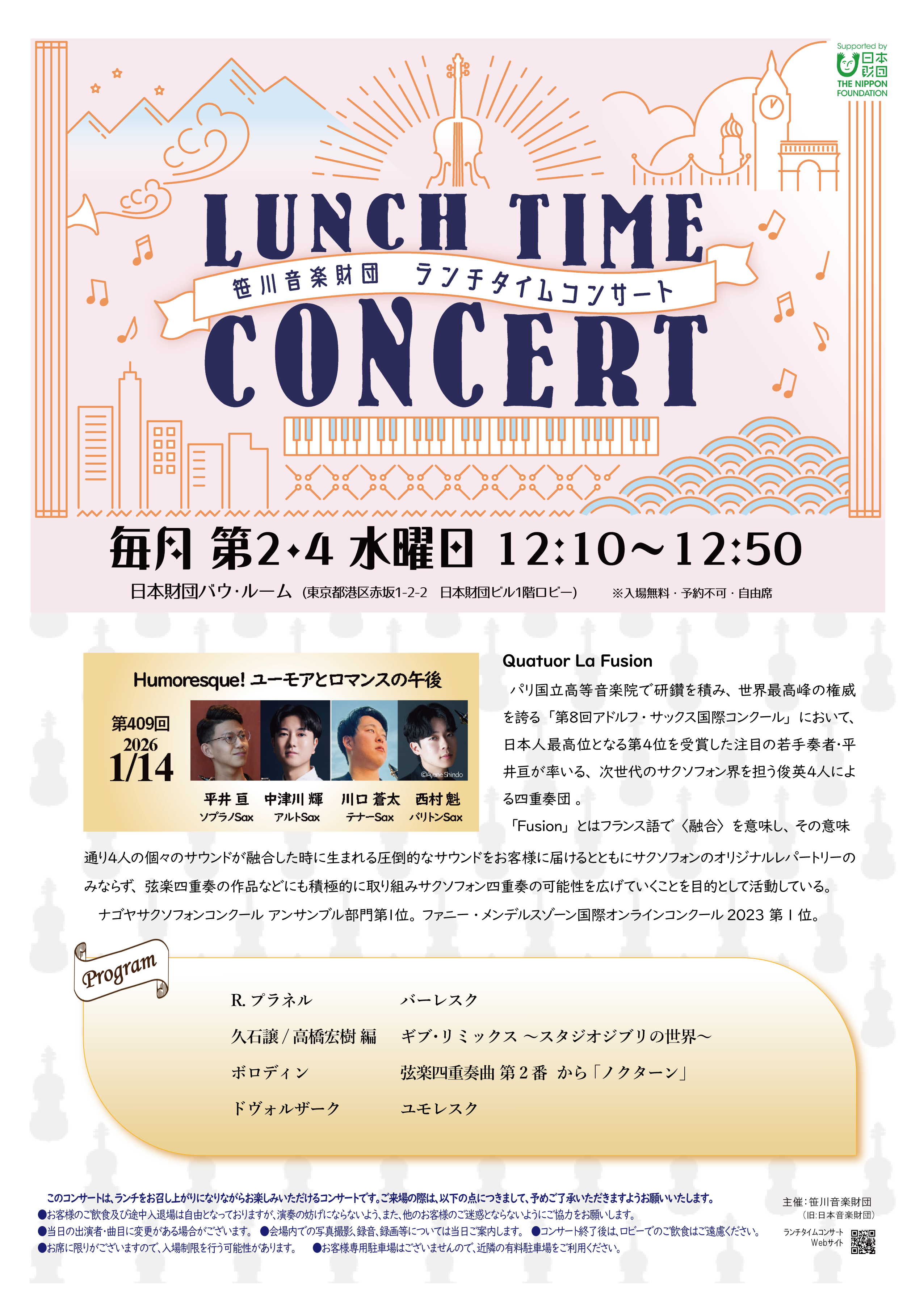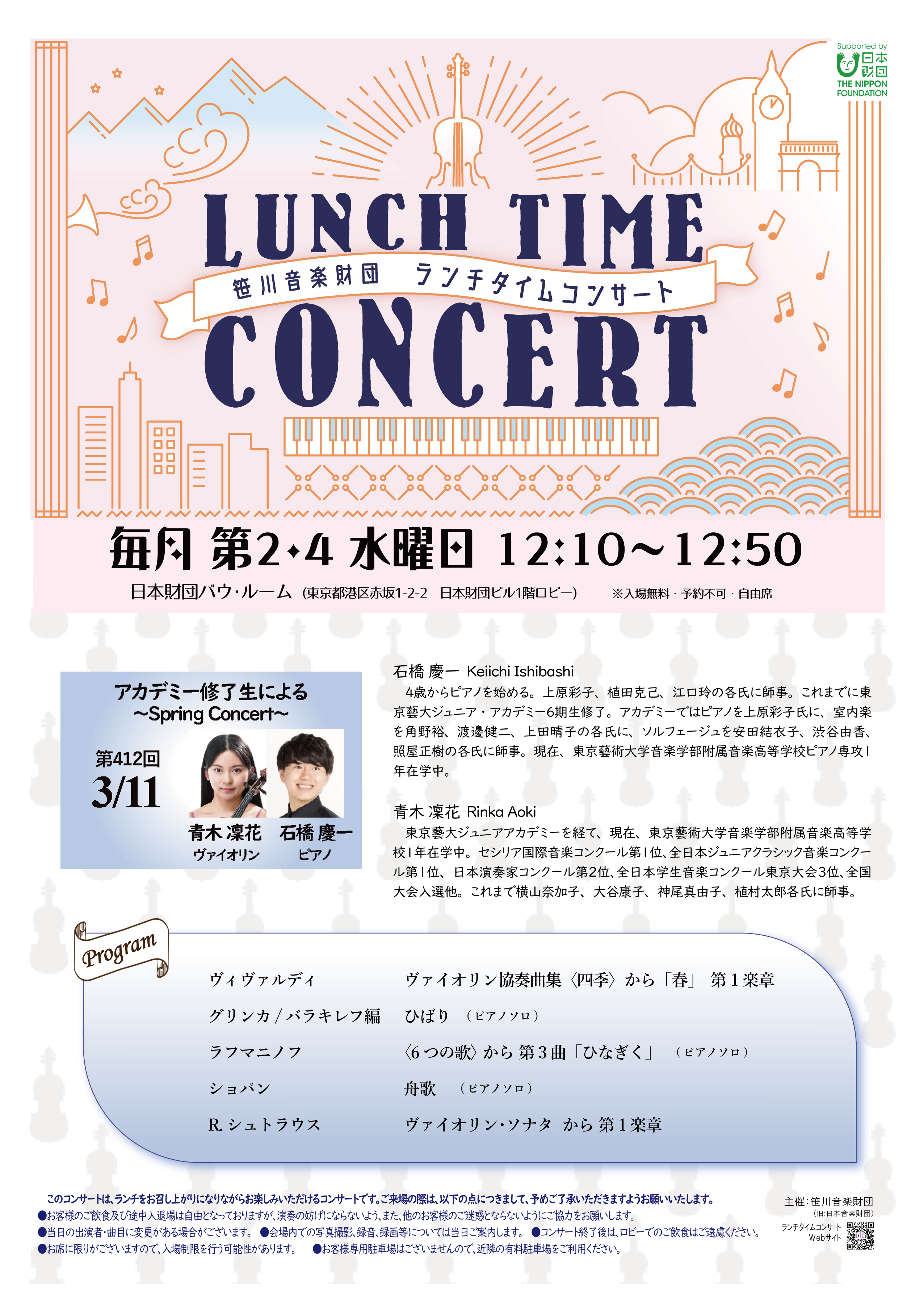 笹川音楽財団はランチタイムコンサートの出演者の募集をしています。詳しくはこちらからご確認ください。