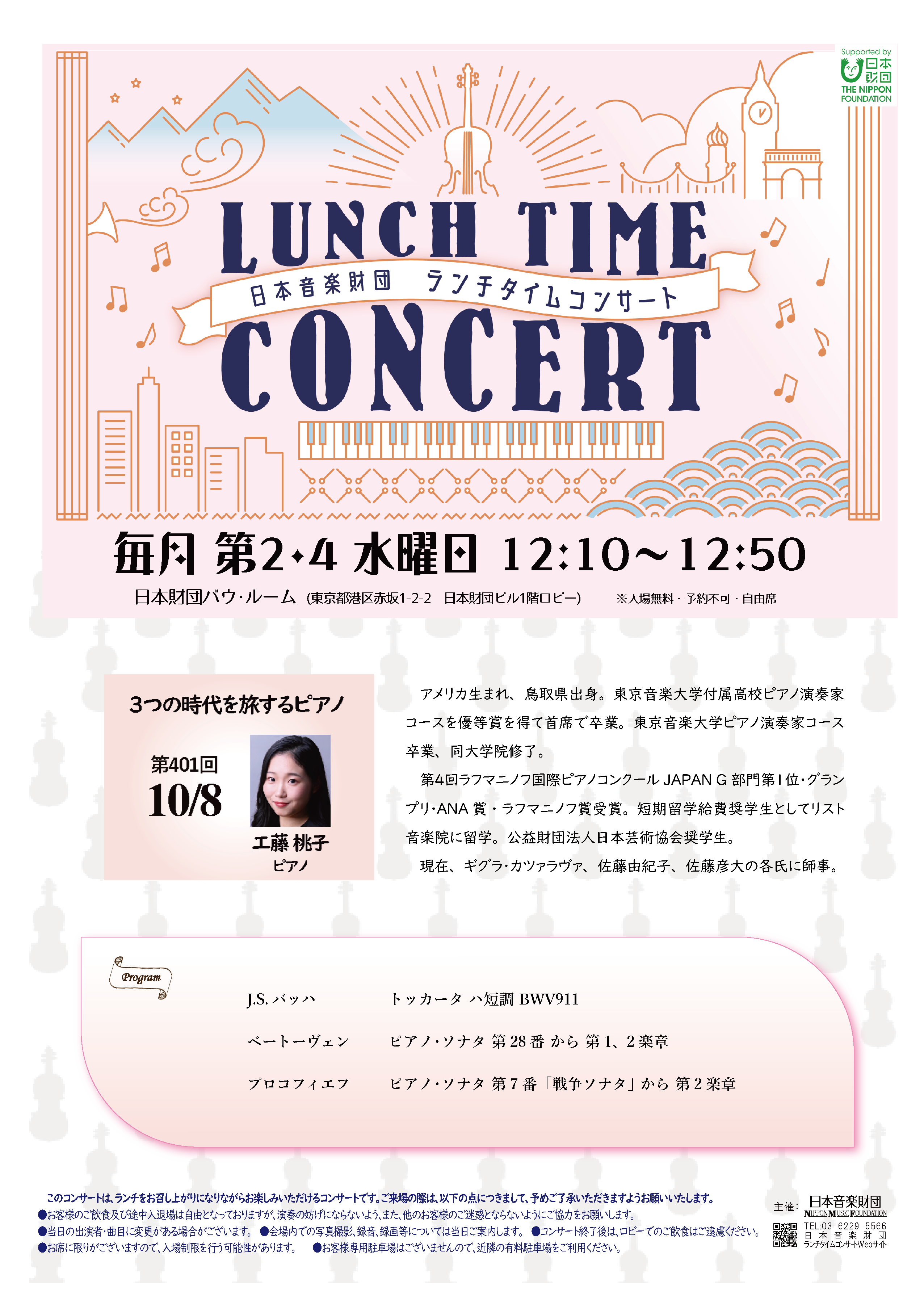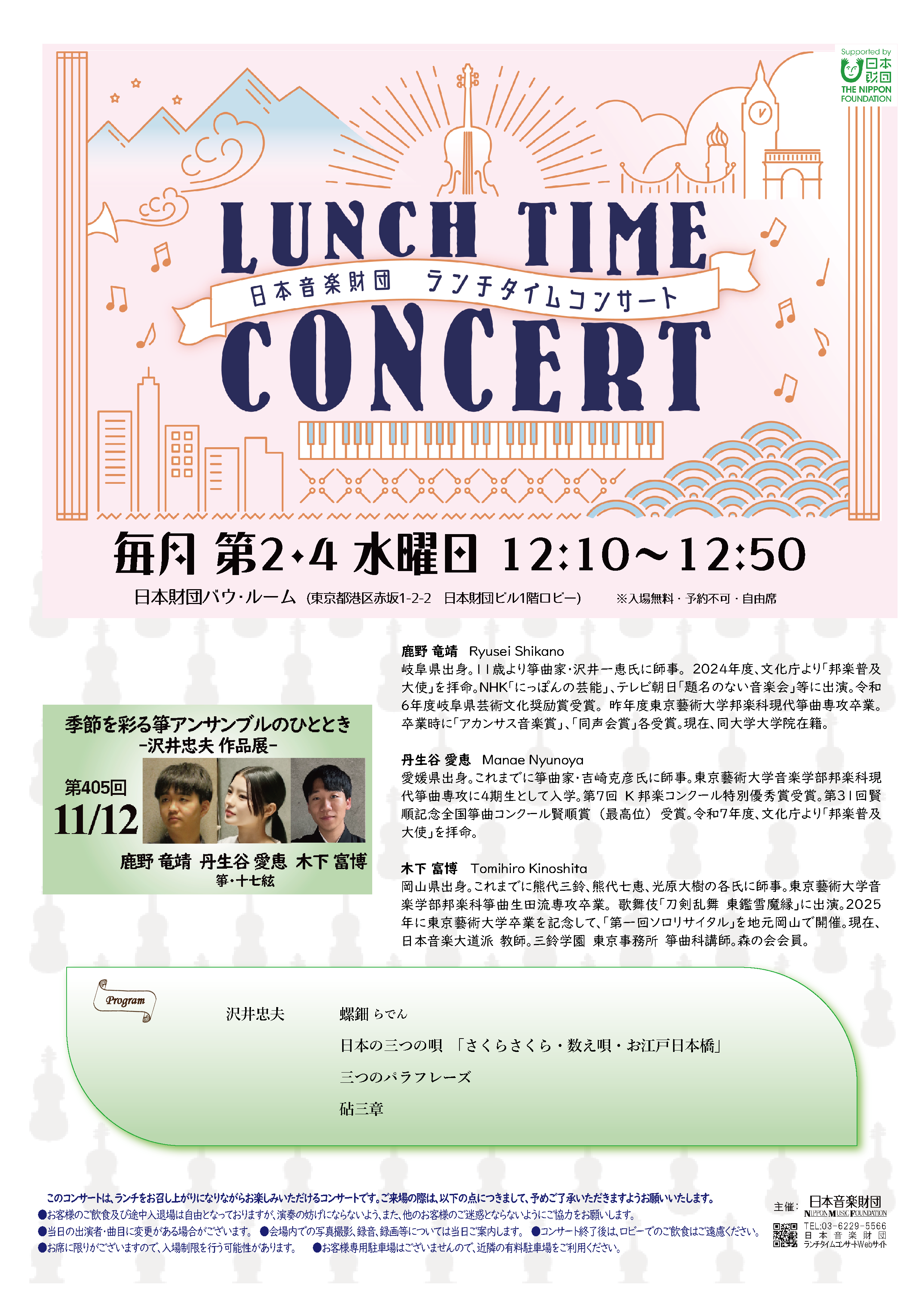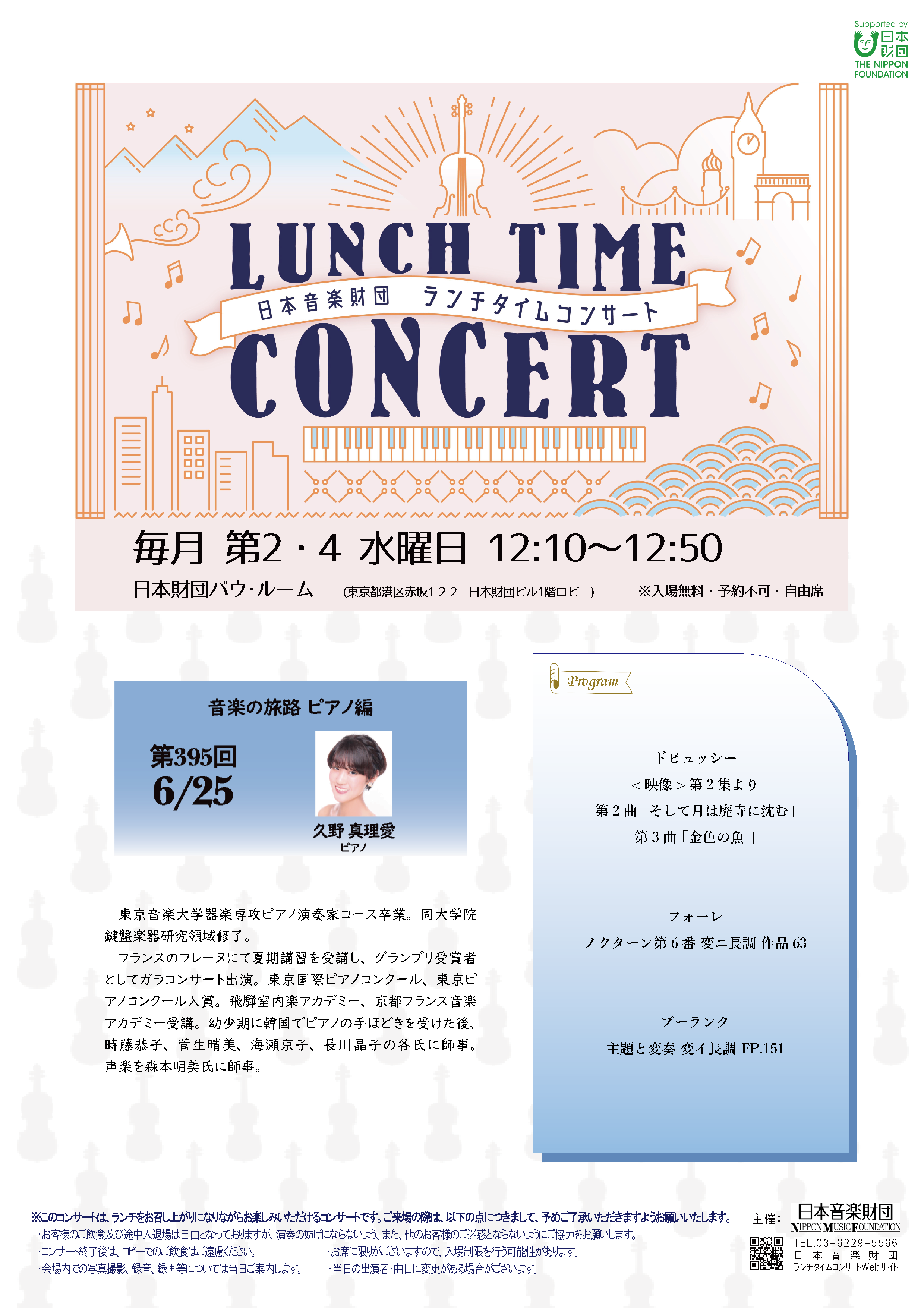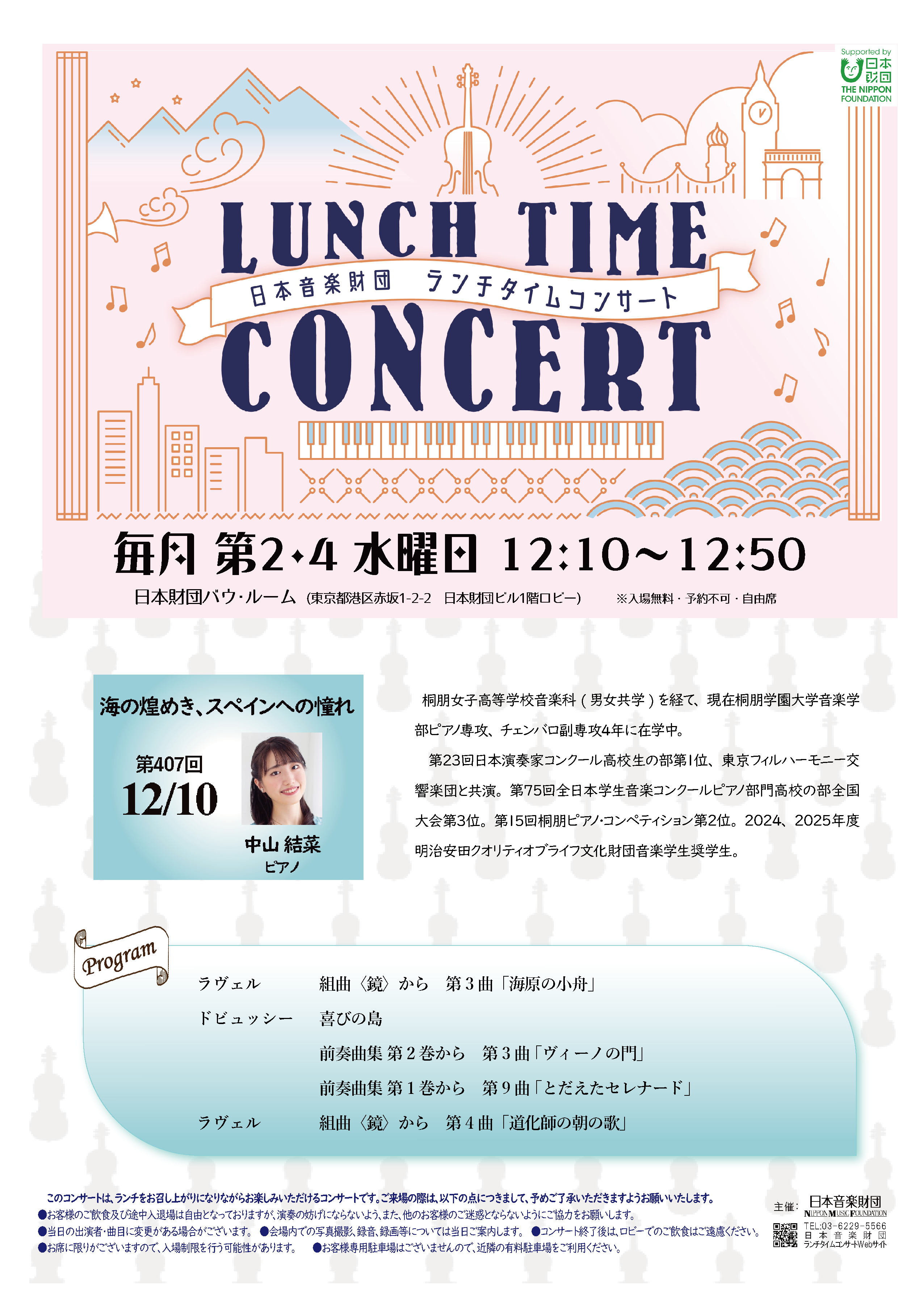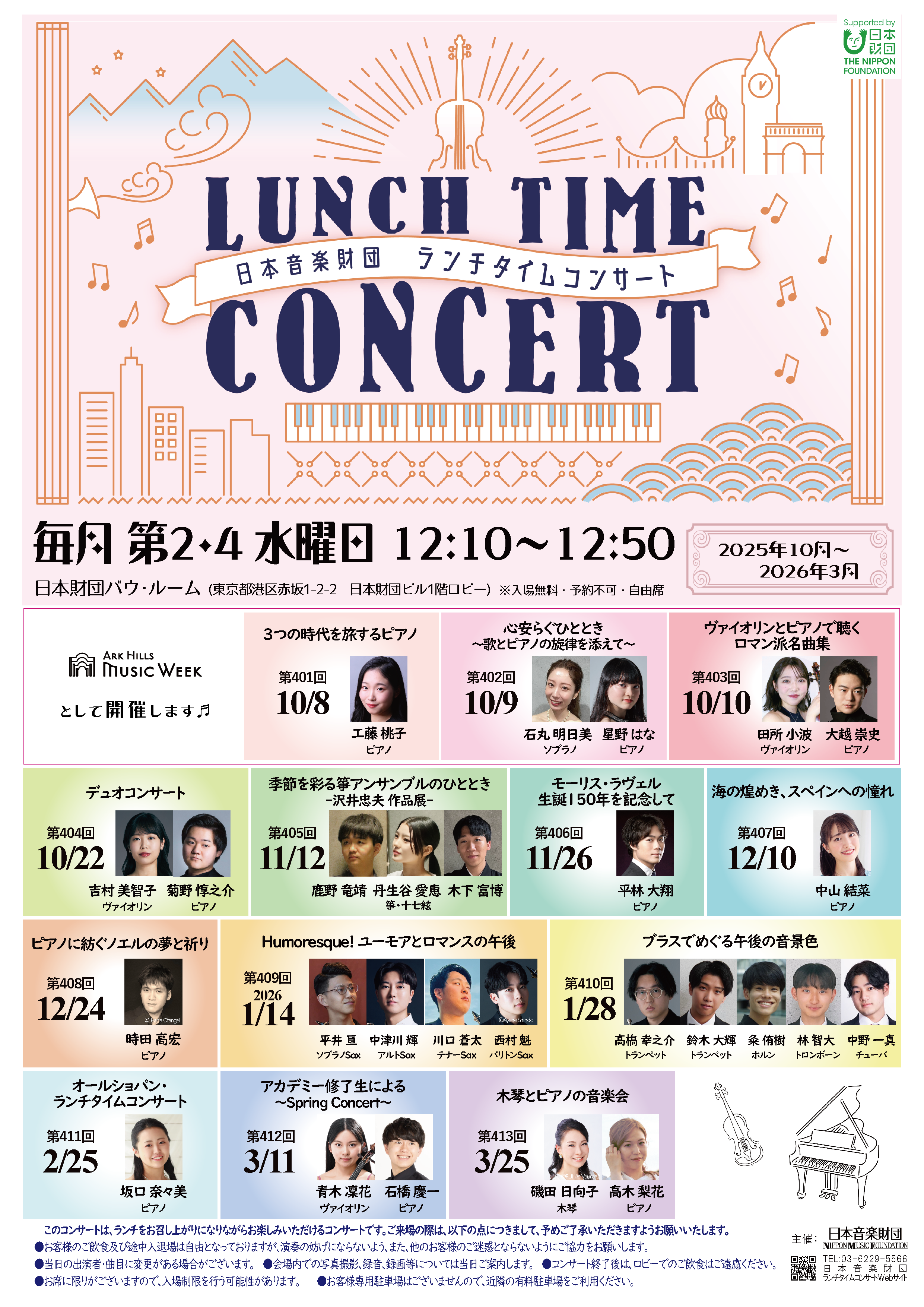笹川音楽財団はランチタイムコンサートの出演者の募集をしています。詳しくはこちらからご確認ください。