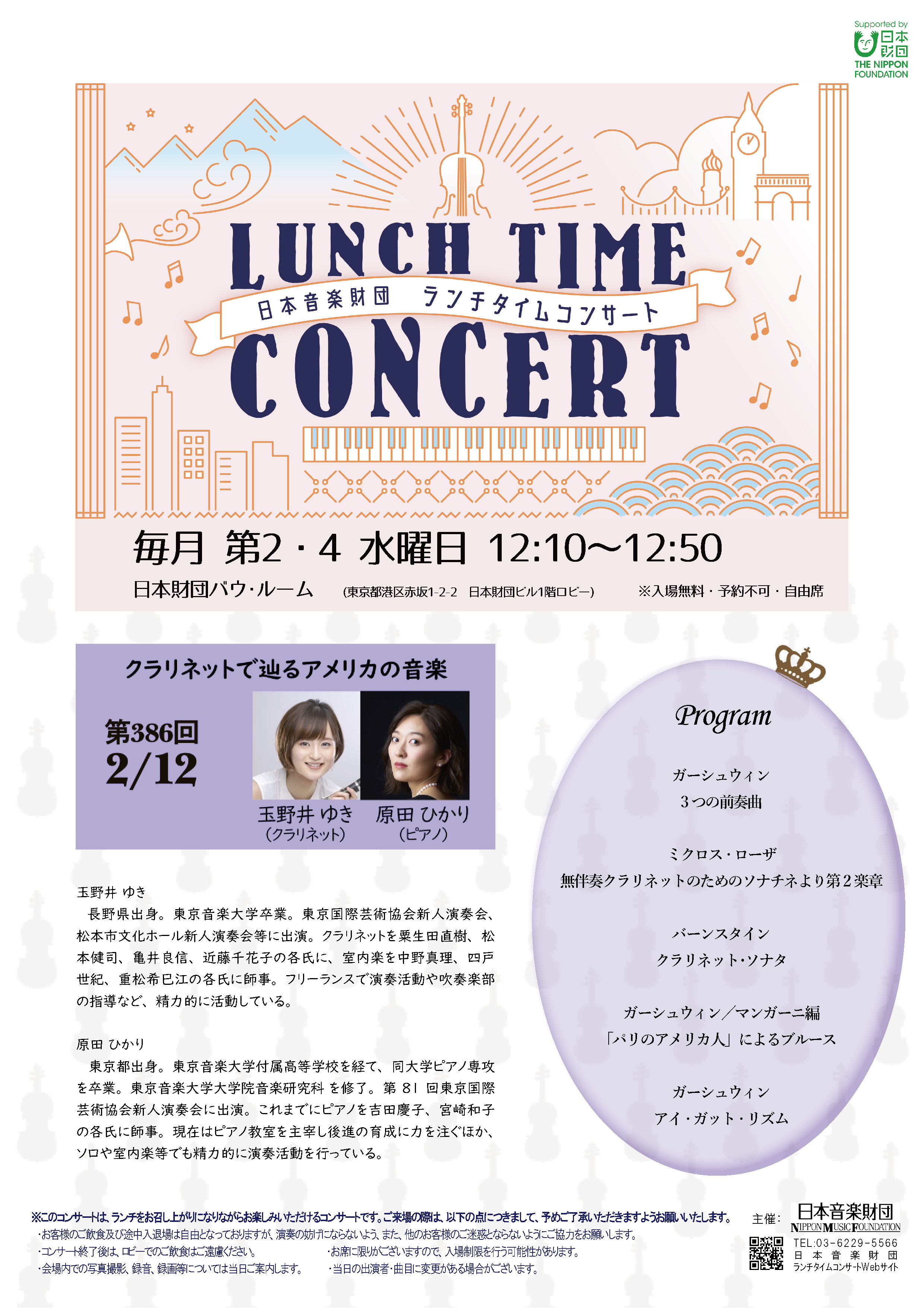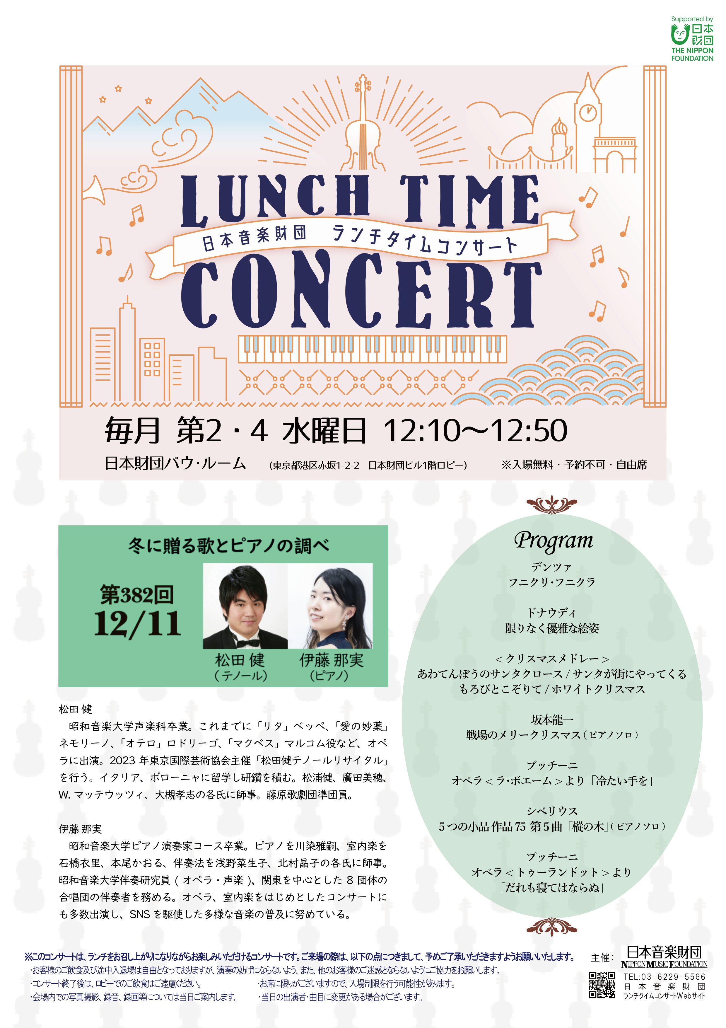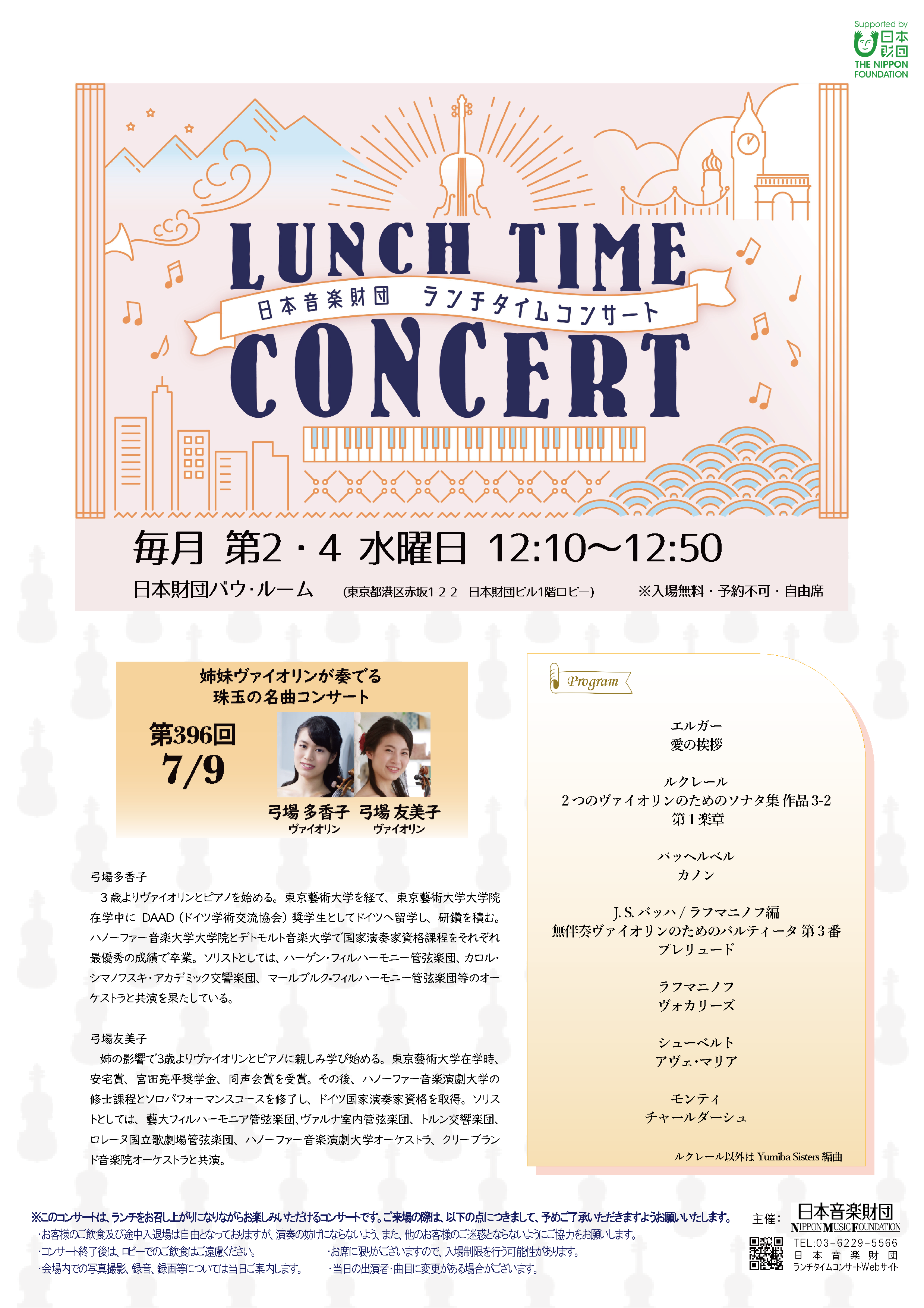 笹川音楽財団は、若手演奏家に演奏の機会を提供するとともに、地域の皆さまに音楽を気軽に鑑賞いただくため、毎月第2・4水曜日にランチタイムコンサートを無料で開催しています。 このコンサートでは、ランチをお召し上がりになりながら、弦楽器を中心に様々な楽器やジャンルの音楽をお楽しみいただけます。