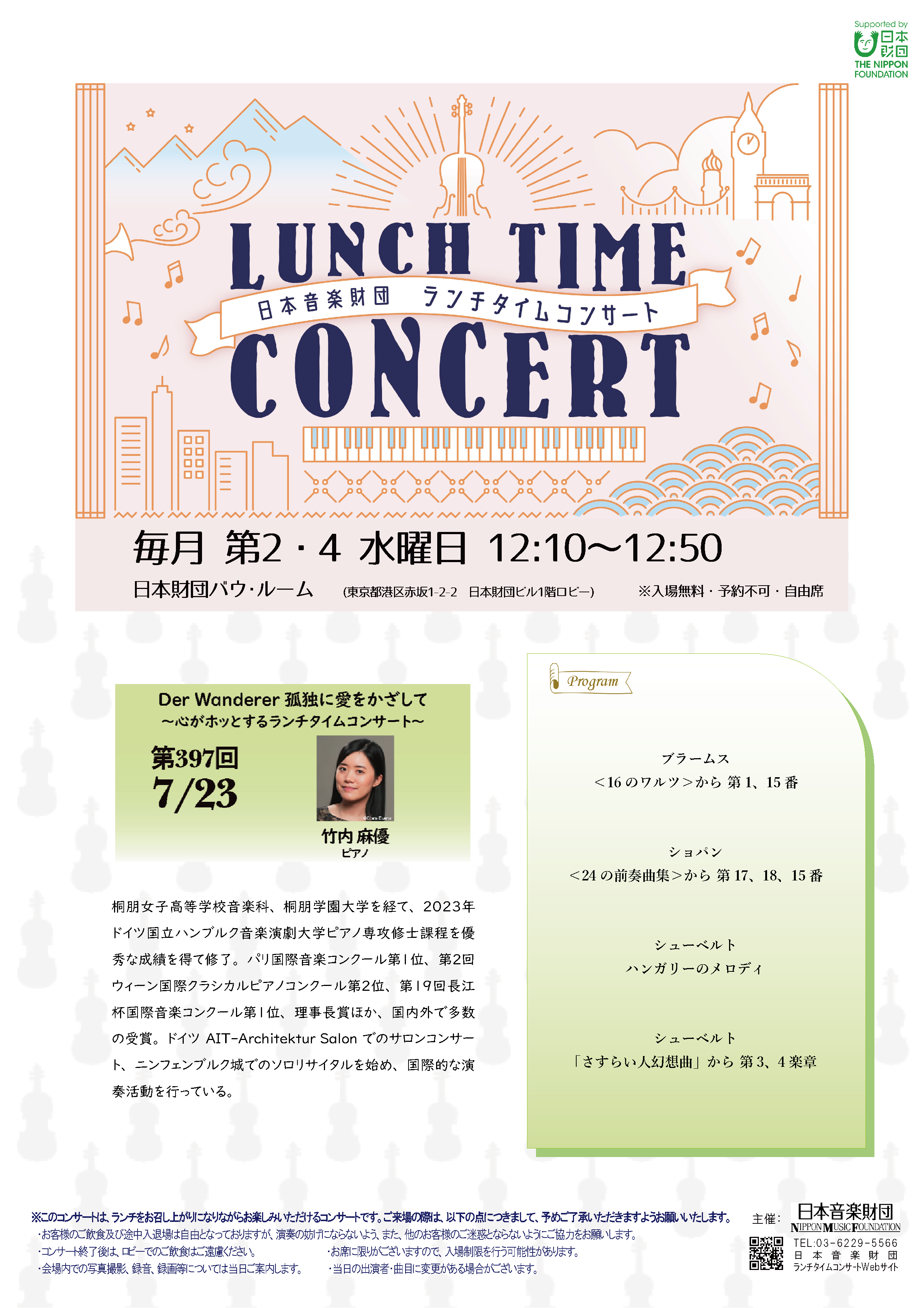 竹内 麻優/ピアノ | Der Wanderer 孤独に愛をかざして 〜心がホッとするランチタイムコンサート~ |